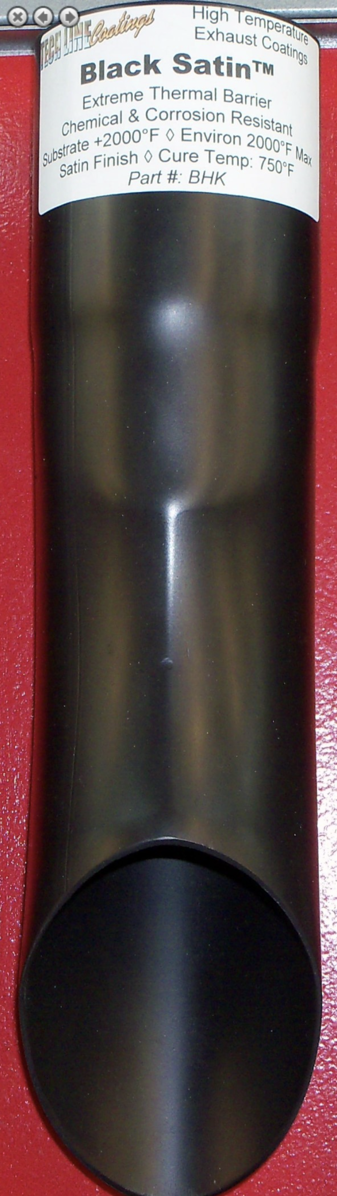 Black Satin (BHK) is a ceramic reinforced thermal barrier coating originally designed to handle reentry temperatures for space vehicles. It has been modified for easy application to automotive exhaust components. When applied to exhaust systems, BHK will remain color stable at exhaust gas temperatures up to 1600�F. Due to its unique ceramic nature, the coating also functions as a very effective thermal barrier, handling exhaust gas temperatures up to 2000�F, while reducing thermal radiation. The coating cures to a very hard, durable surface with excellent adhesion. BHK is designed to be cured in an industrial oven. Corrosion and chemical resistance is only achieved after the coating reaches a full cure. Black Satin can be used to determine exhaust component metal temperatures as it experiences several color changes as base metal temperatures ramp up from 1000�F to 2000�F. This can be a tuning aid.